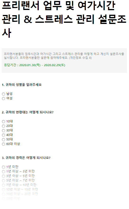 '프리랜서 여가활동 및 스트레스 관리'에 관한 설문조사를 진행합니다.