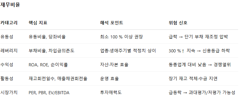 • DuPont 분석= ROE = (순이익/매출)×(매출/자산)×(자산/자본) → 수익성·효율성·레버리지로 ROE를 분해.
