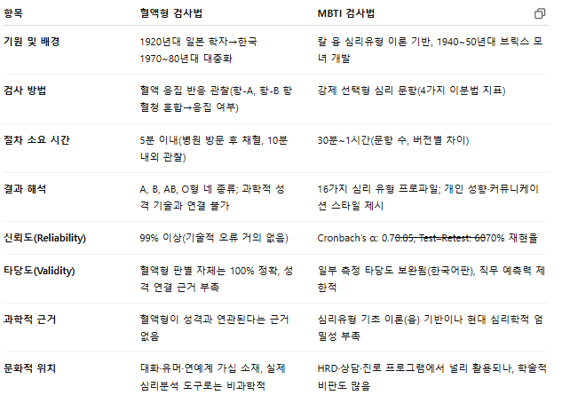 • 한계: 혈액형을 성격 유형으로 연결짓는 것은 과학적 근거가 전무하여, 재미와 대화 소재 그 이상이 되기 어려움.