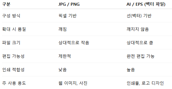 - 기존 JPG 로고를 벡터로 바꾸고 싶다면, 디자이너에게 ‘벡터화 해달라’ 요청하면 됨