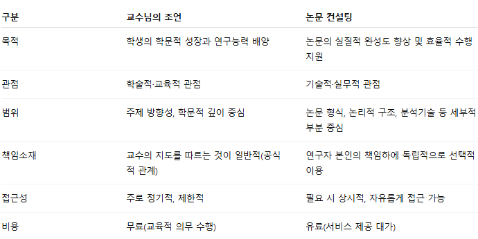 즉, 교수님의 조언은 학문적 성장을 위한 교육적 피드백이라면, 논문 컨설팅은