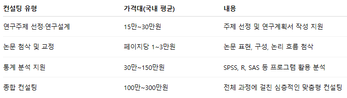 논문 컨설팅은 "논문 첨삭, 연구방법 지도, 통계 분석 지원, 연구계획서 및 초안 피드백" 등을 포함하며,