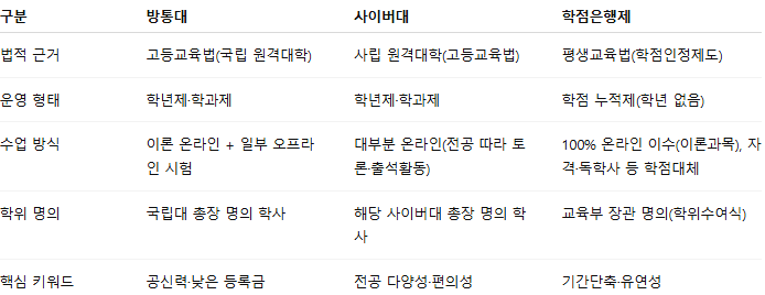이 공백을 메우는 대표적 원격 경로가 바로 방송통신대학교, 사이버대학교, 학점은행제 세 가지다.