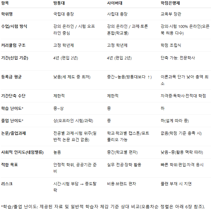 세 제도 모두 온라인 수업을 활용하므로 일과 학습 병행이 가능하지만, 구조·비용·졸업 방식·난이도가 크게 다르다.