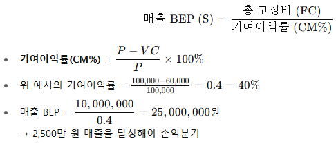 기여이익률, 고정비·변동비 구조, BEP 판매수량·매출액 산출