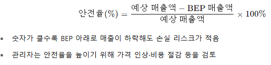안전율(Margin of Safety): 실제 예측 매출과 BEP 매출 간 간격