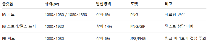 • 인스타 피드: 1080×1080(정사각) 또는 1080×1350(세로)