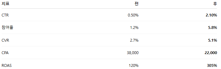 • 지표(예) : CTR 0.5% / 참여율 1.2% / ROAS 120% / CAC(고객획득비용) 과다.