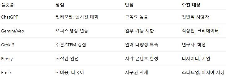 예를 들어 연구자는 Grok 3, 디자이너는 Firefly, 직장인은 Gemini, 전방위 사용자라면 ChatGPT가 가장 적합하다.