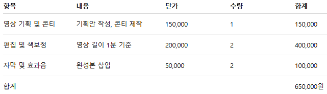 • 논리형 표기: “1분 길이 영상 제작(기획, 편집, 색보정 포함) – 300,000원 / 평균 시청시간 기준”