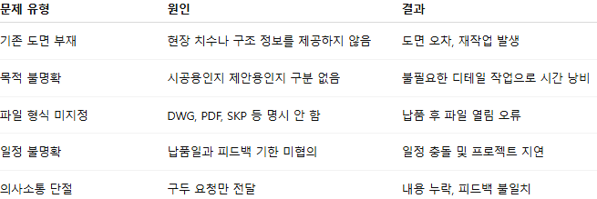 도면 제작 과정은 불필요하게 길어지고, 수정이 반복되며, 비용이 늘어나게 된다.