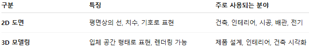CAD 작업은 크게 2D(평면 제도)와 3D(입체 모델링)으로 구분된다.
