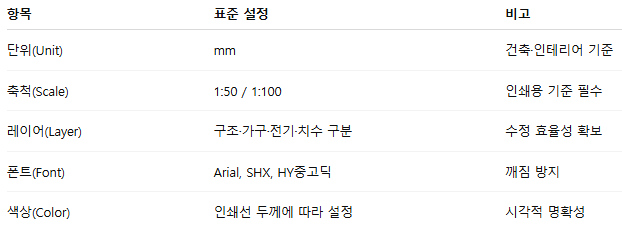 또한 출력용 도면의 경우 A3·A2·A1 사이즈와 축척(예: 1:100)을 함께 지정해야
