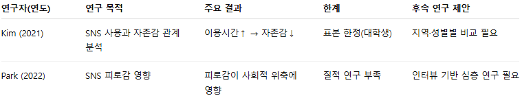 예: “SNS 사용과 자존감 간의 관계는 선행연구에서도 꾸준히 보고되었다(Kim, 2021).”