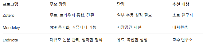 C. 참고문헌 관리 프로그램별 장단점 비교표