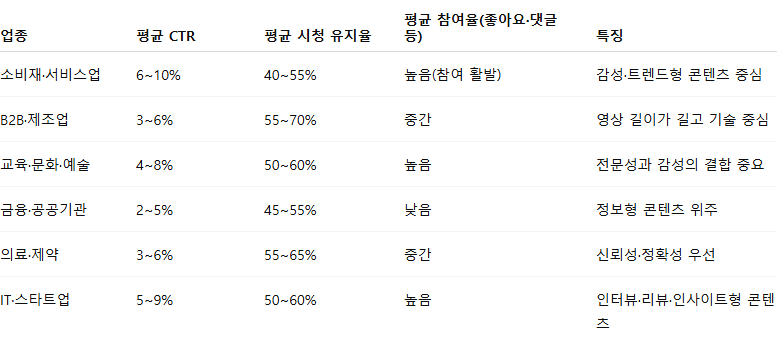 유튜브의 업종별 평균 성과는 동일하지 않습니다.