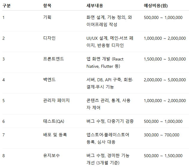 (※ 중소 규모 MVP 기준, 기능 확장 시 최대 30,000,000원 이상 가능)