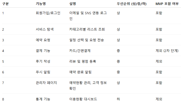 • 결제·리뷰 기능은 MVP 2차 단계에서 도입 예정