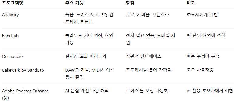단순 낭독 정리에는 Audacity, 고품질 마스터링엔 Cakewalk가 적합하다.