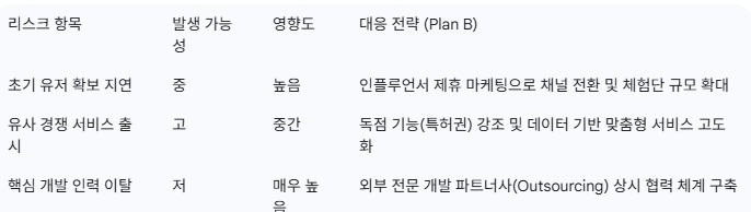 • 재무 리스크 : 투자 유치 지연, 예상보다 빠른 현금 소진(Burn Rate), 환율 및 원자재 가격 급등