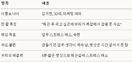 페르소나를 만들 때 가장 중요한 것은 구체성입니다. "30대 직장인 여성"이 아니라
