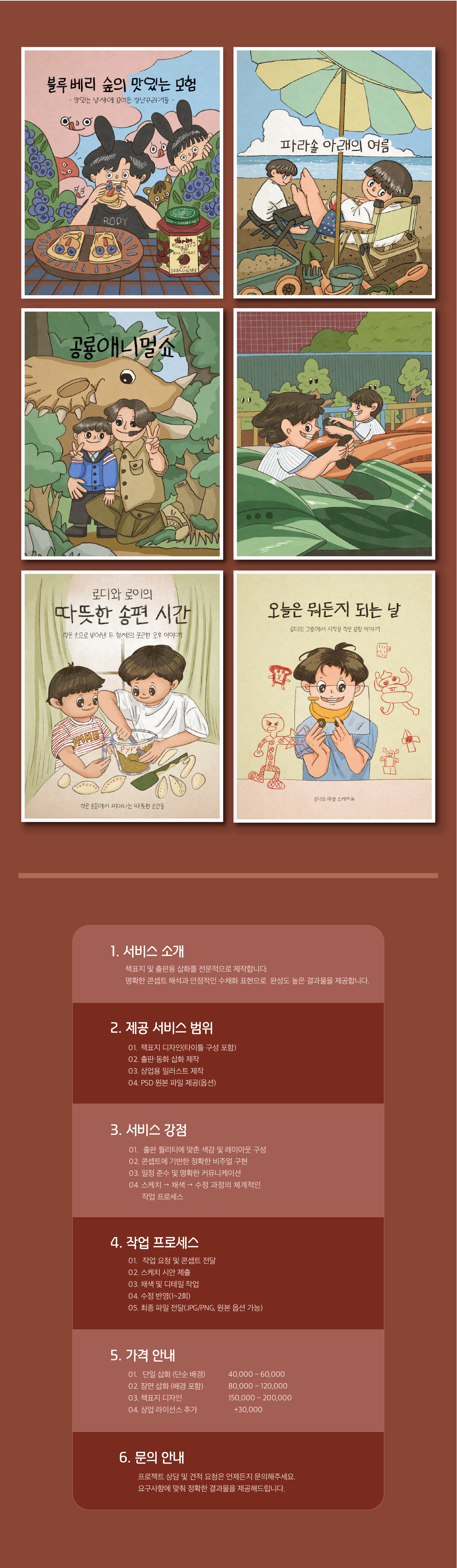 출판용 퀄리티로 제작하며, 동화풍·감성 일러스트에 최적화된 스타일을 제공합니다.