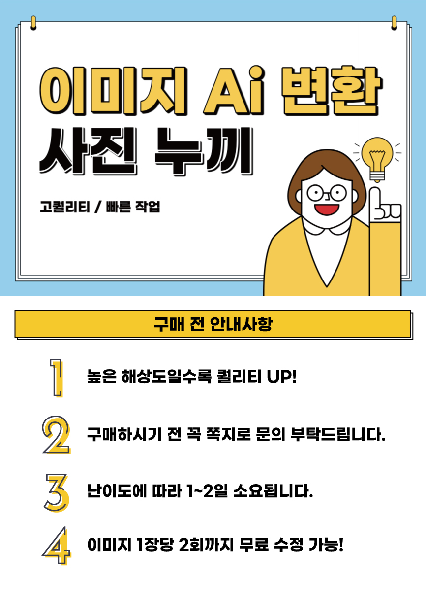 3. 작업 후 1장 당 수정은 2회를 해드립니다. (추가적인 수정사항은 별도의 금액이 있을 수 있습니다.)