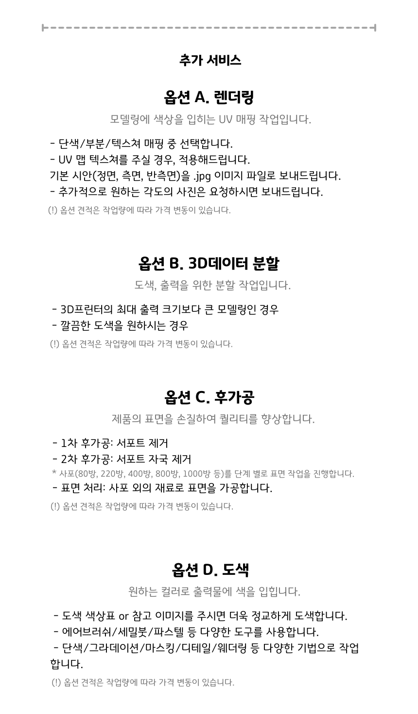 재출력: 모델링/출력 옵션/설정을 변경하실 경우, 재출력으로 측정되어 이에 따른 추가 금액이 발생합니다.