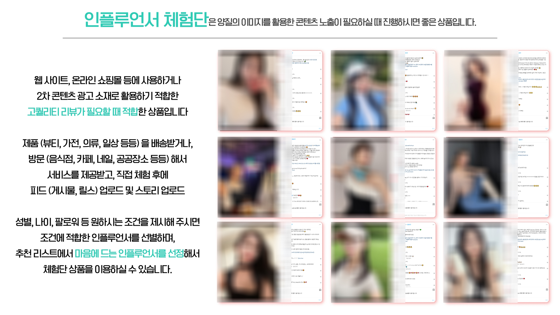 맞춰 분야(모델, 패션, 뷰티, BJ, 등등) 별 인플루언서 섭외를 진행해 드리고 있습니다.