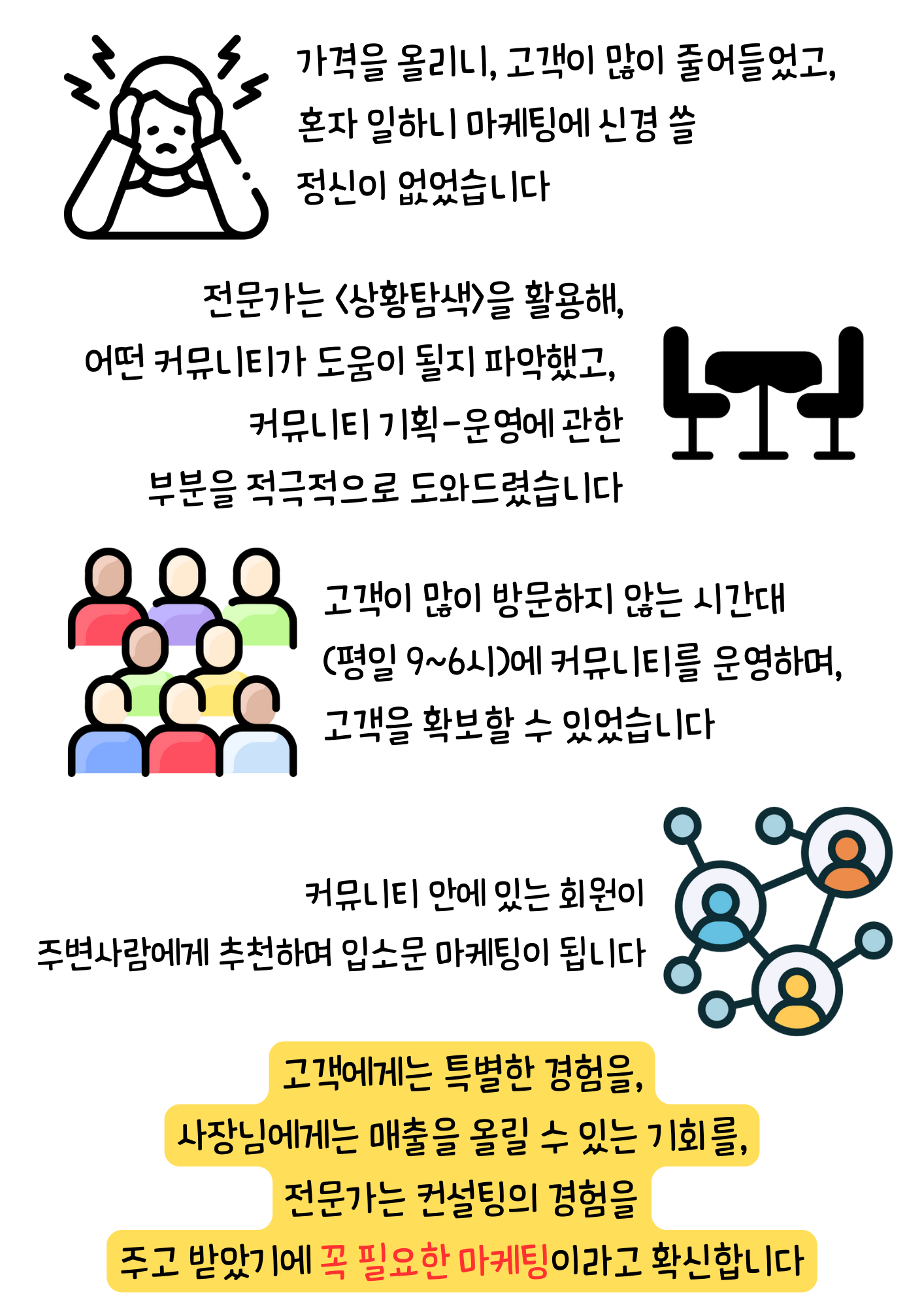 고객분들을 자연스럽게 유치되는 커뮤니티 마케팅을 진행해보시면 좋겠습니다.