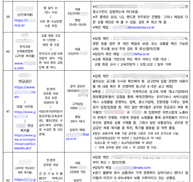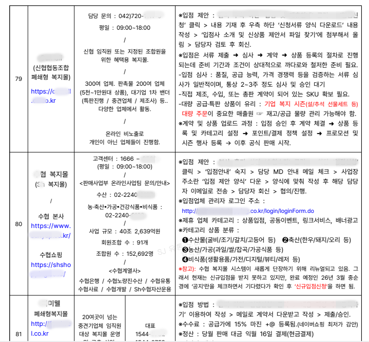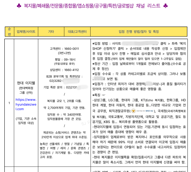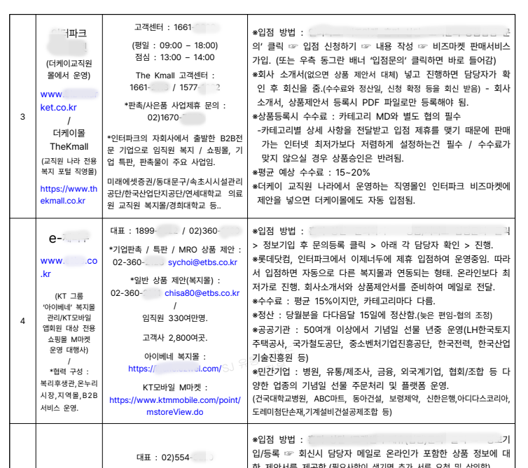 【 복지몰 + 폐쇄몰 + 전문몰 + 종합몰 + 공구몰 + 글로벌샵 】 등.. 6종류의 몰로 각 사이트명 / 사이트 주소 / 회사 연락처 /