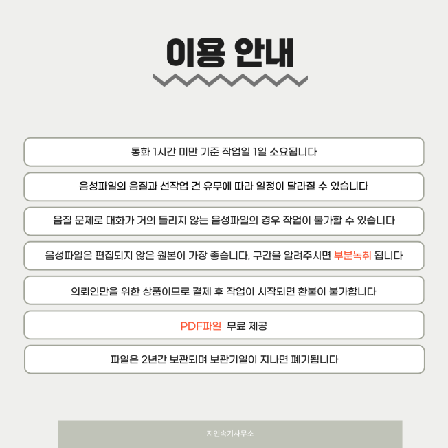 4. 완성된 녹취록은 전자문서인 PDF로 드립니다. (실물 녹취록 수령을 원하실 경우 말씀해 주세요)