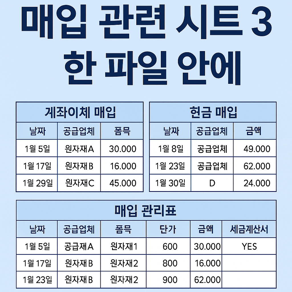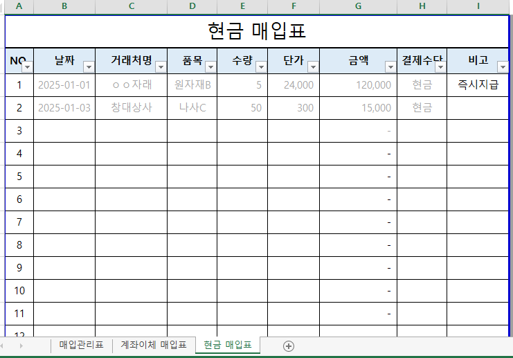 계좌이체, 현금매입 관리 3종 시트로 지출을