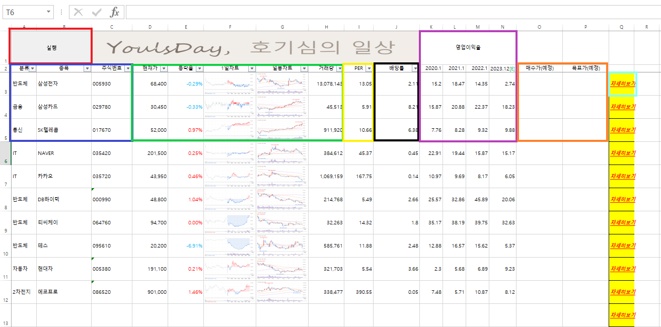 파란색으로 표시된 열은 원하는 종목에 따라 수정하여 관리합니다.