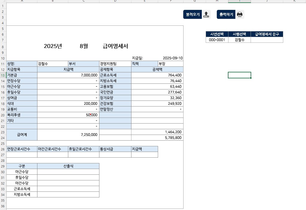 간이세액표 로직이 내장되어 있어, 기본급과 수당만 입력하면 공제액과