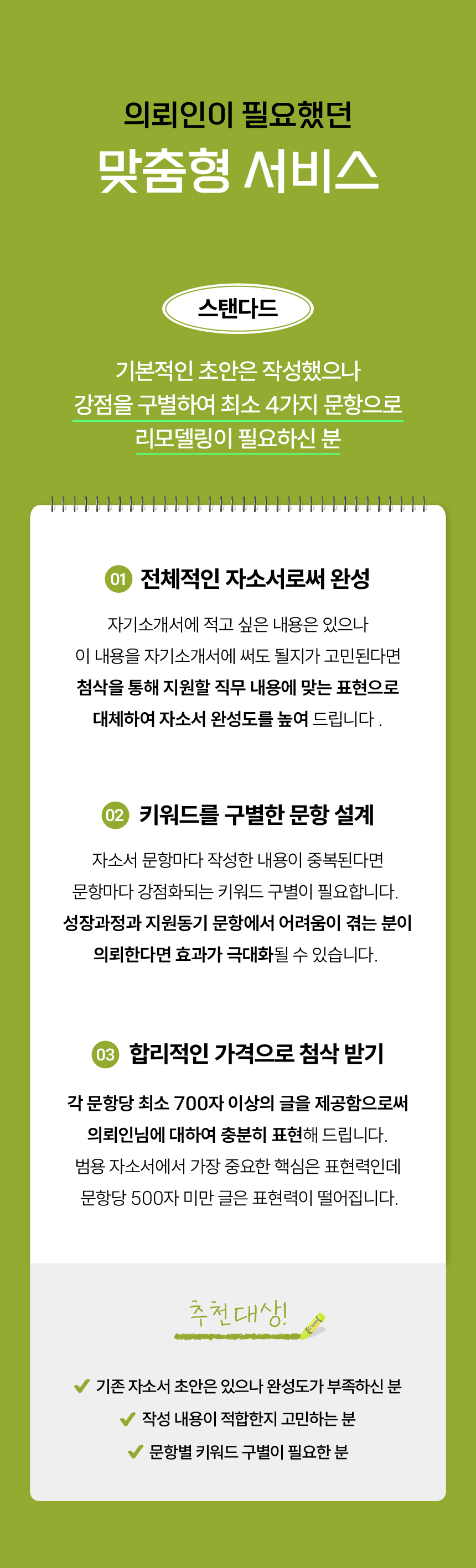 -초안은 작성했으나 문항 구성이 어려운 분, 직무에 맞는 내용 수정이 필요하신 분들에게 추천드리는 유형입니다.