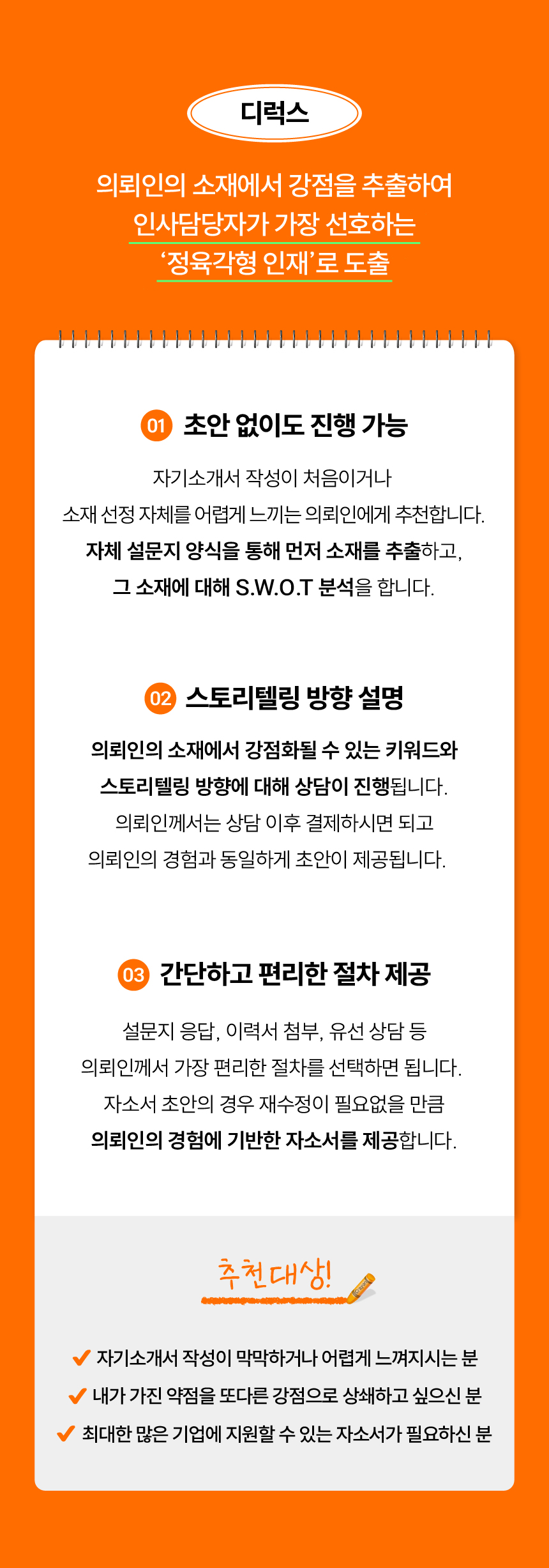 -이력서와 기작성된 초안을 주시면 진행 방향과 개선점을 안내드린 후 작업이 바로 진행됩니다. 초안 검토 결과 활용 가능한 내용이 50% 이상(약 1,500자)일 경우 해당 유형으로 진행됩니다.