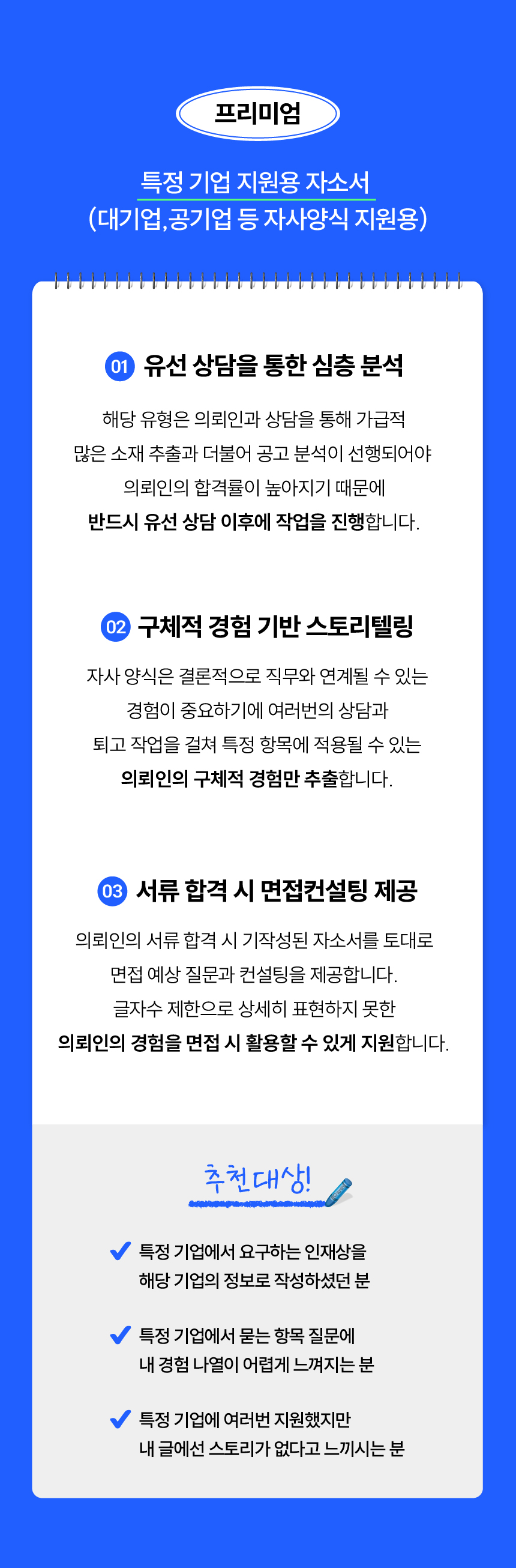 -심층 상담을 통해 구체적 경험 기반의 스토리텔링을 바탕으로 해당 기업의 특정 문항에 맞는 의뢰인만의 자소서를 완성합니다.