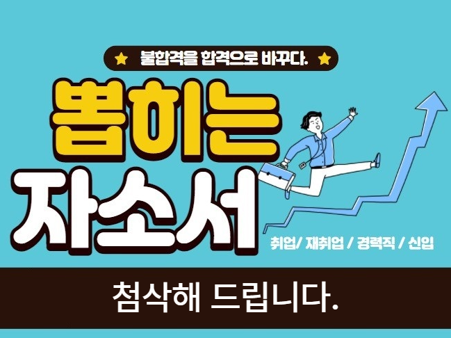 -미사여구만 가득한 자기소개서가 아닌 제대로 된 업무 능력을 갖춘 인재임을 드러낼 수 있는 가장 좋은 인재를 제안한다는 자신감이 넘치는 자소서로 만들어드립니다.