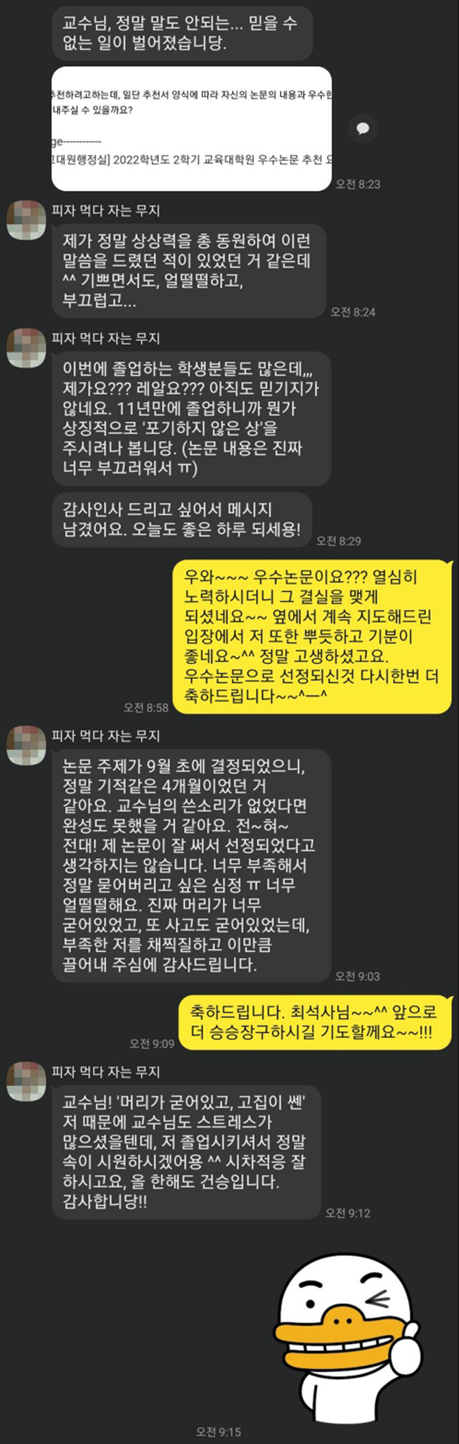 - 매번 미팅 때마다 정확하고 명쾌한 피드백으로 논문의 완성도를 최고 수준으로 끌어올립니다.