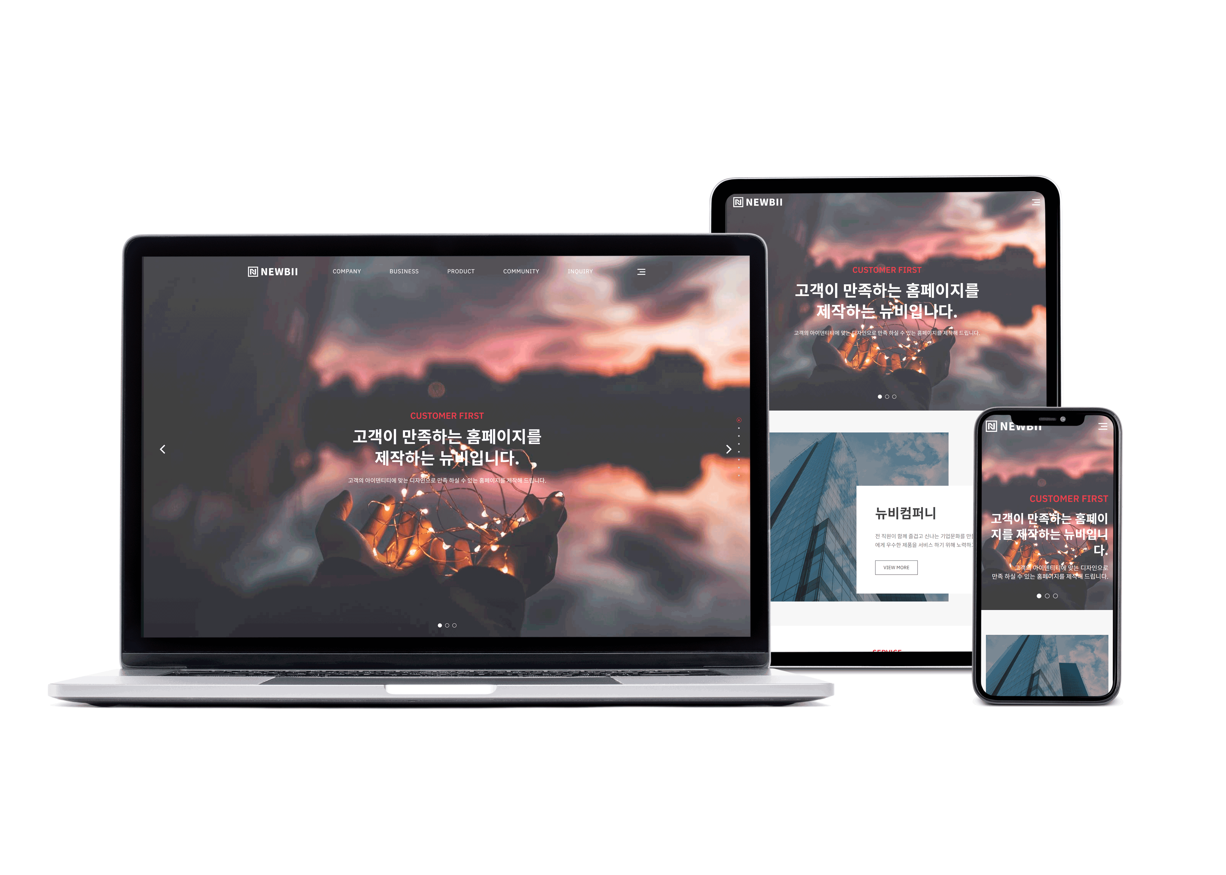 뉴비에서는 데스크톱, 태블릿PC, 스마트 폰에 맞게 디자인이 자동으로 반응해서 변경되는 반응형 홈페이지를 기본으로 제작합니다.