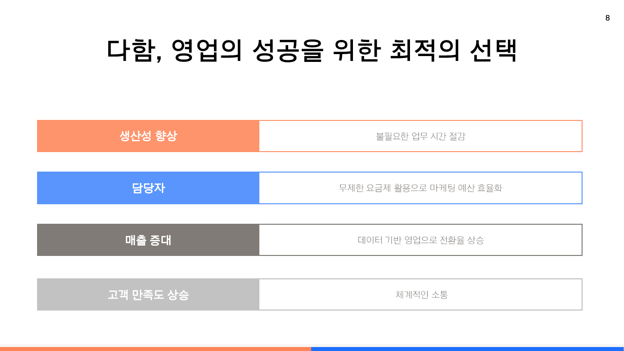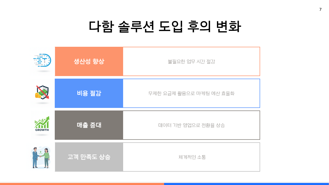 '다함 문자 영업 솔루션'은 영업의 비효율을 줄이고, 더 많은 고객과 소통하며, 최종적으로 영업 성과를 끌어올리는 가장 강력한 도구가 될 것입니다.