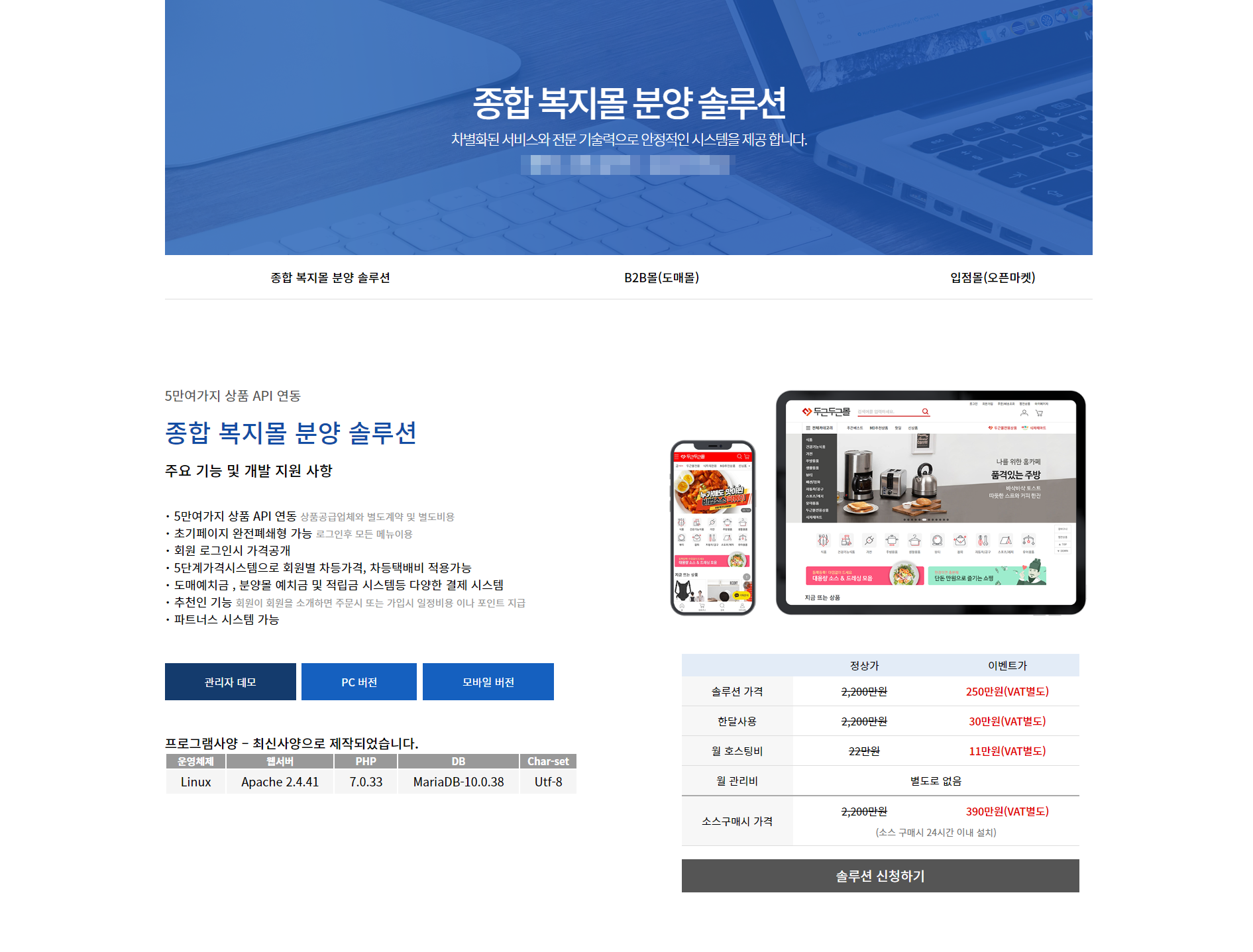 - 기존의 기술력을 바탕으로 분양몰 시스템,네트워크 정산 시스템 등 여러가지 솔루션을 저렴하게 제공해 드리고 있습니다.