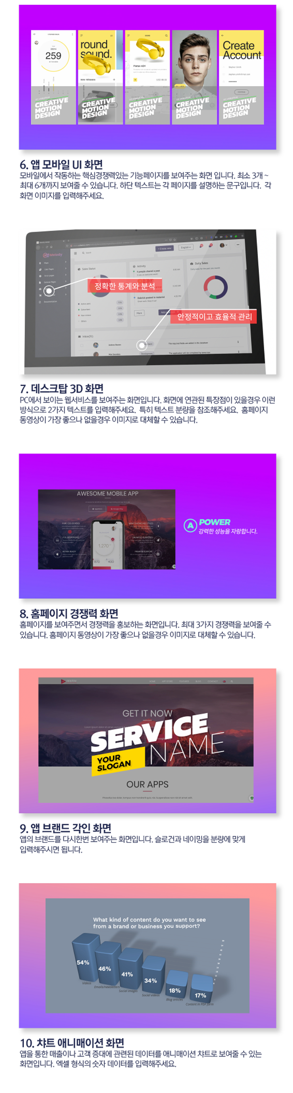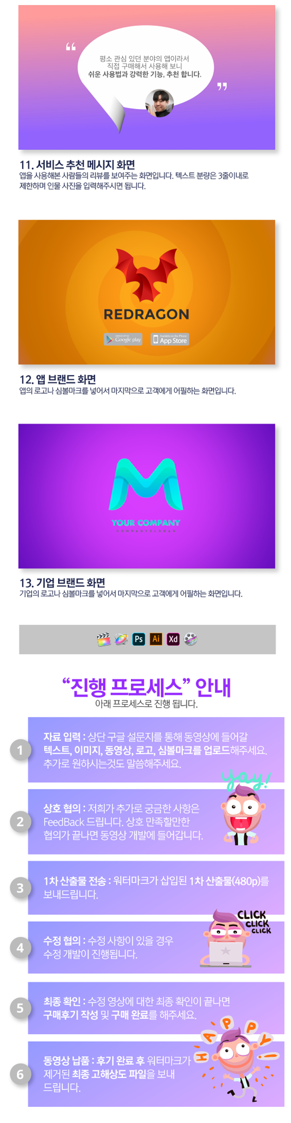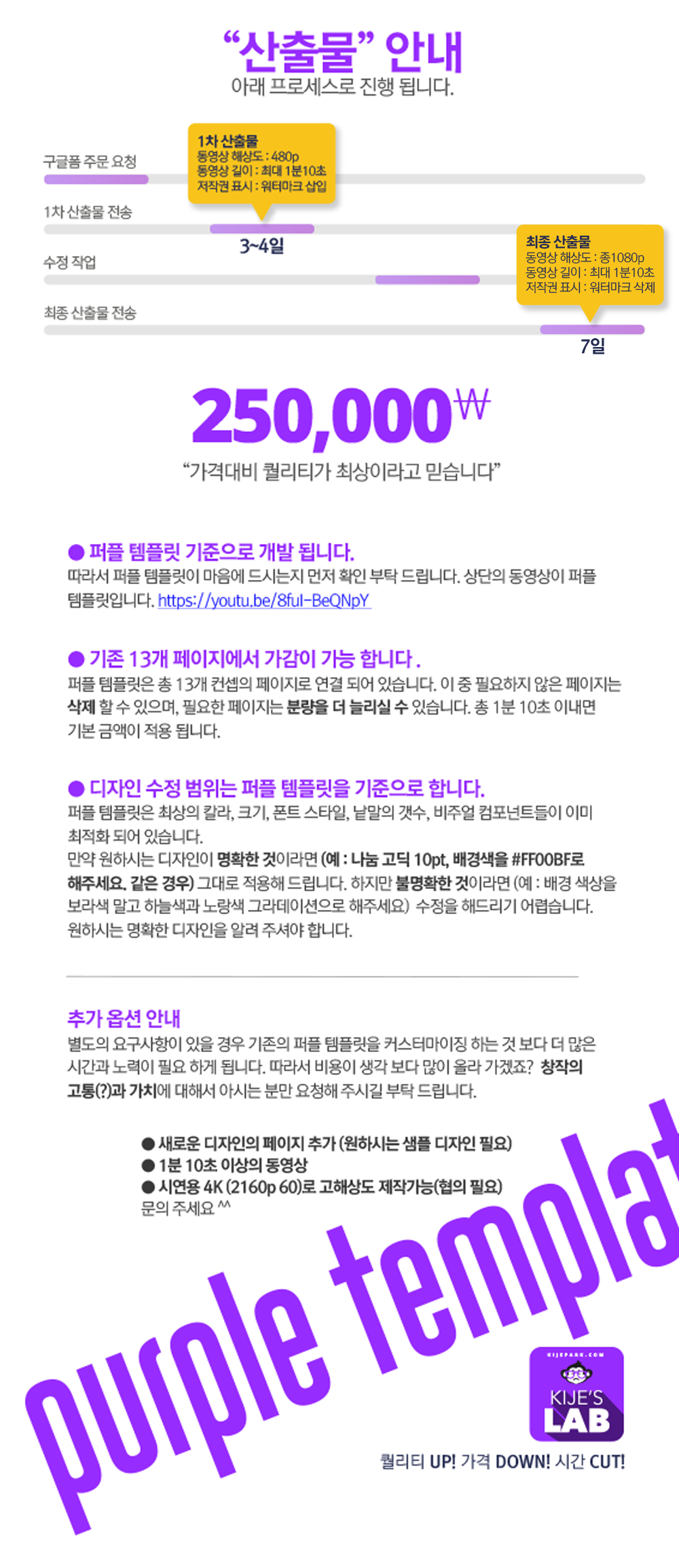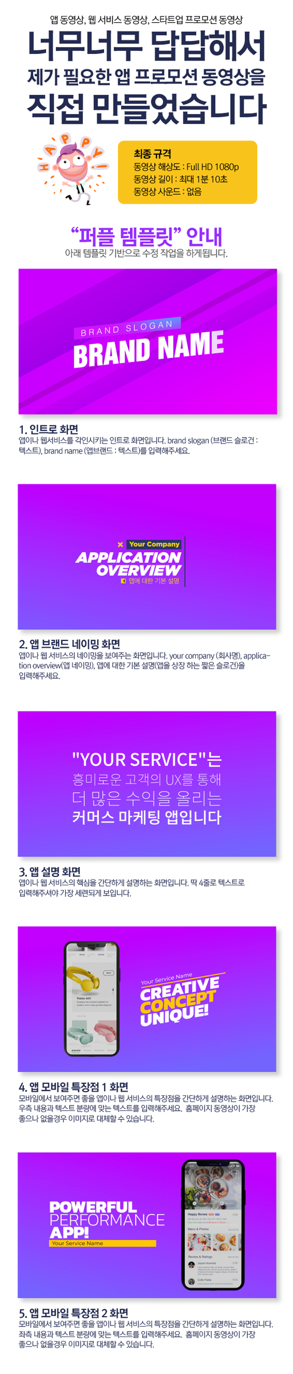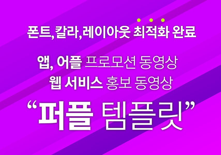 상단의 "퍼플 템플릿" 동영상을 기준으로 쉽고 빠르고 정확하게 높은 퀄리티의 동영상을 개발해드립니다.