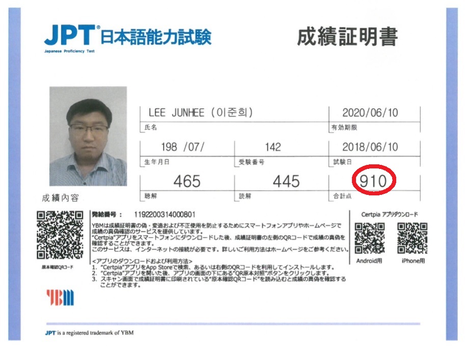 일본어를 하는 사람들은 "JPT 900점"을 꿈의 점수라고 하는데, 저는 JPT 910점으로