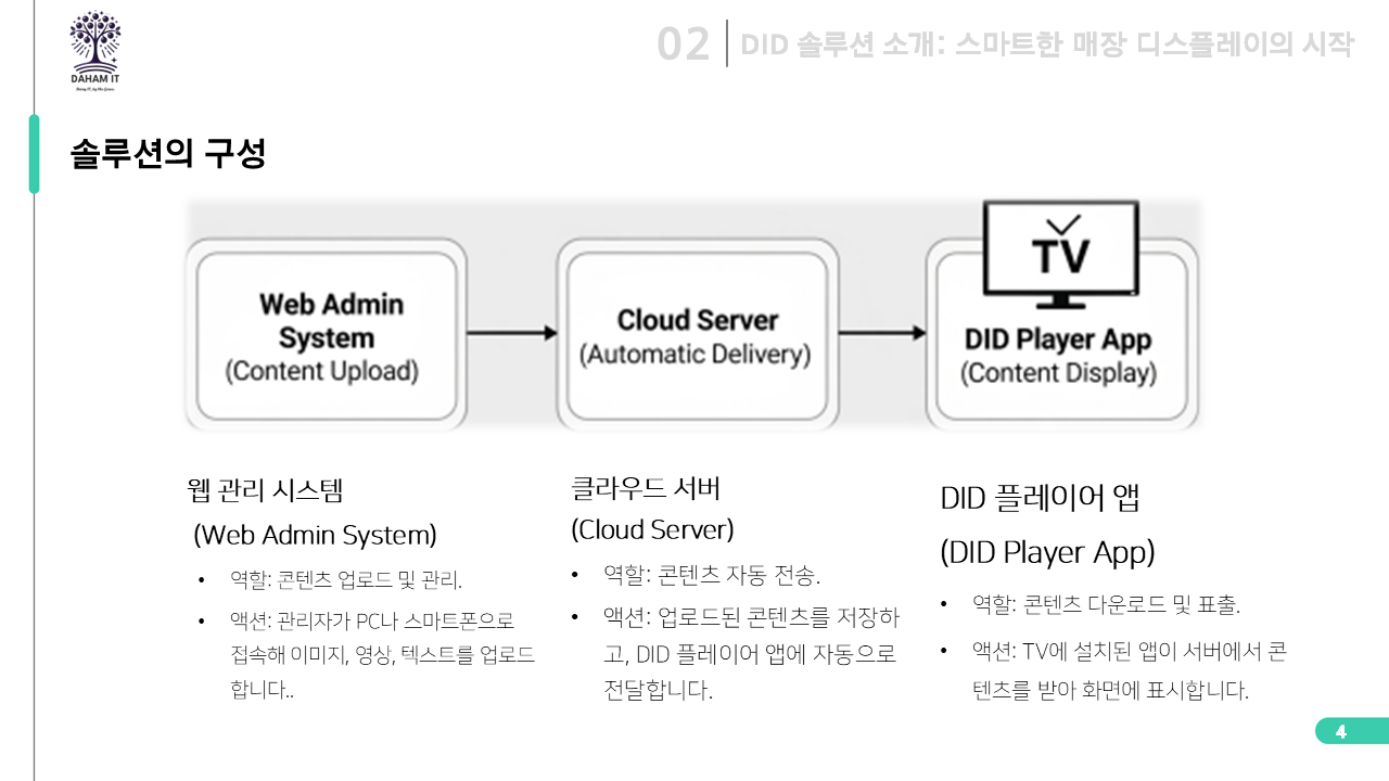 저희 다함 DID 솔루션은 복잡한 설치나 전문 장비 없이, 기존의 TV를 강력한 디지털 광고판(DID)으로 변신시켜 드립니다. 스마트폰처럼 쉬운 조작으로, 누구나 콘텐츠를 바꾸고 원하는 광고를 내보낼 수 있습니다.