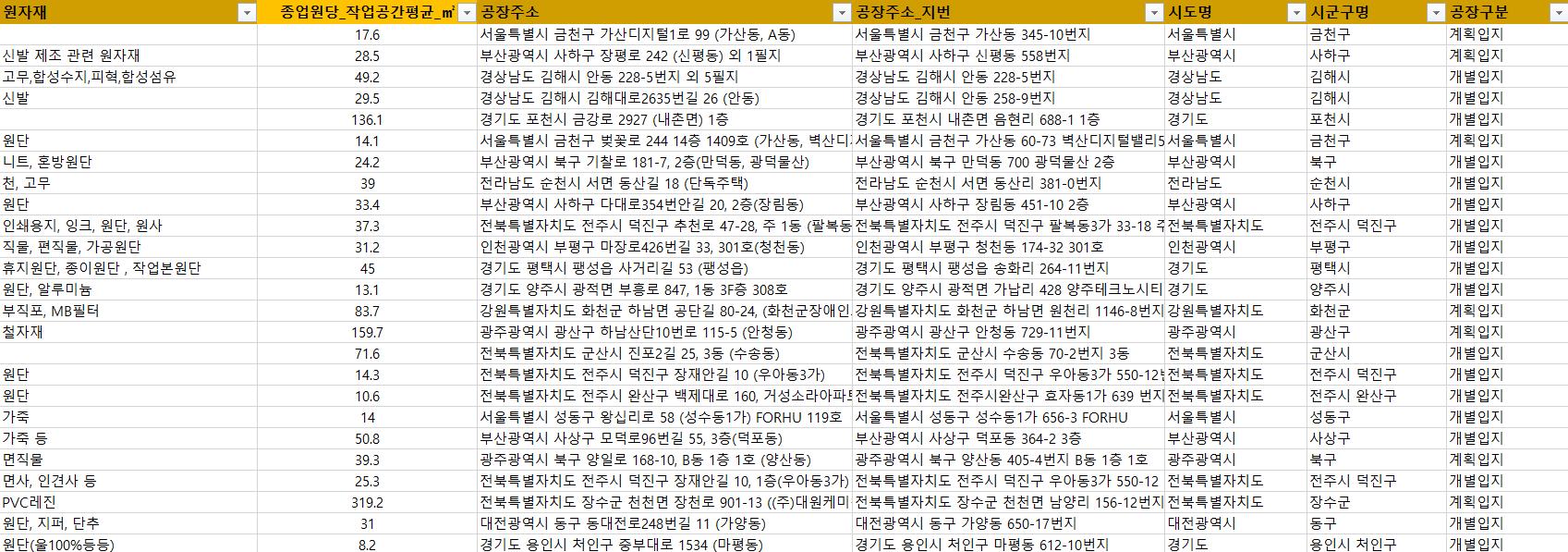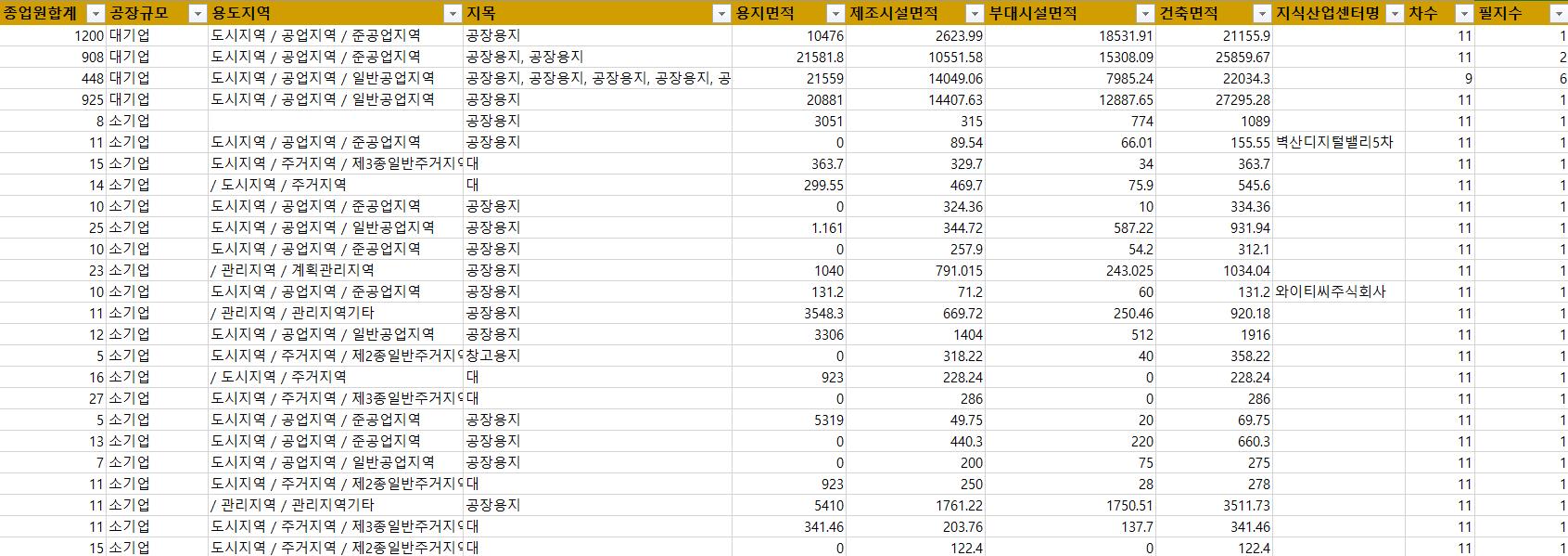 - 공장주소, 공장주소_지번, 시도명, 시군구명, 공장구분, 단지명, 용도지역, 지목, 지식산업센터명, 차수, 필지수