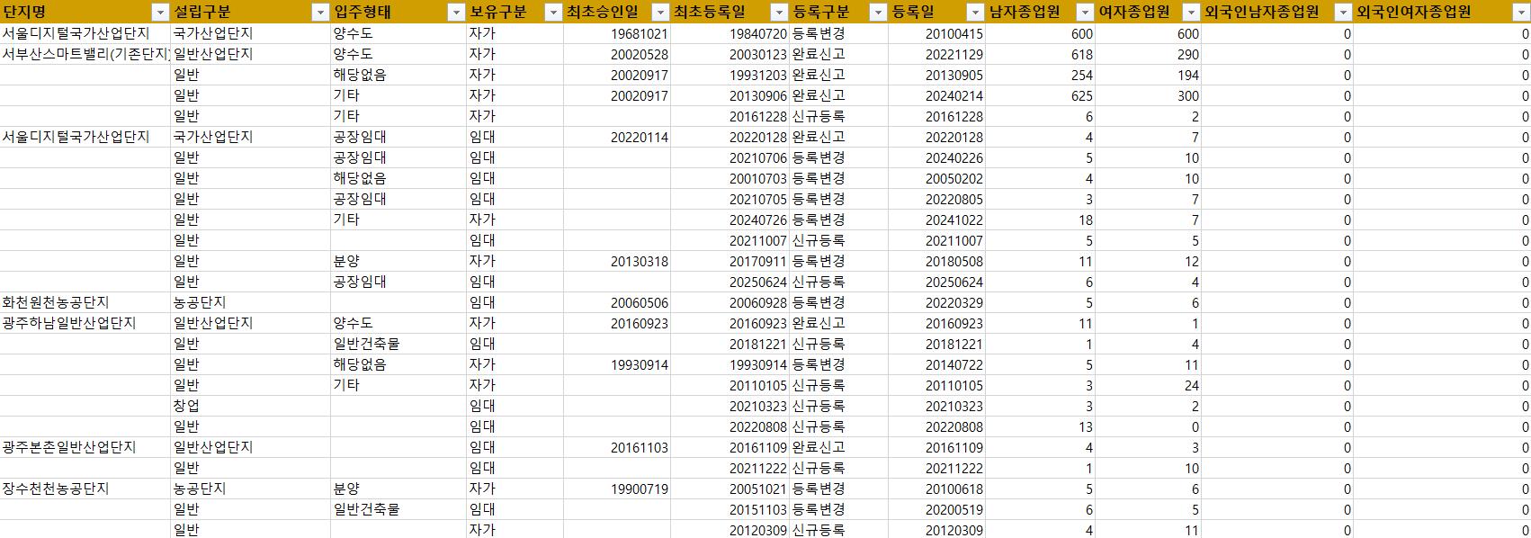 - 설립구분, 입주형태, 보유구분, 최초승인일, 최초등록일, 등록구분, 등록일, 남자종업원, 여자종업원, 외국인남자종업원, 외국인여자종업원, 종업원합계, 공장규모