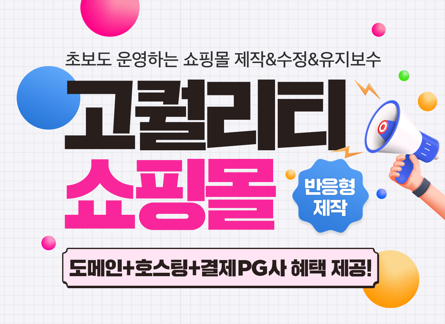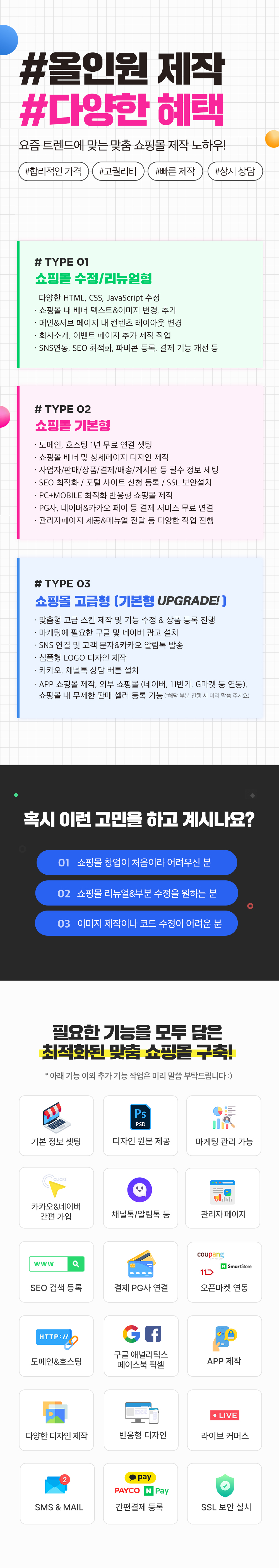 쇼핑몰 제작, 레이아웃, 코딩, 기능 구현 등 개선 수정/리뉴얼/유지보수 작업도 가능합니다.