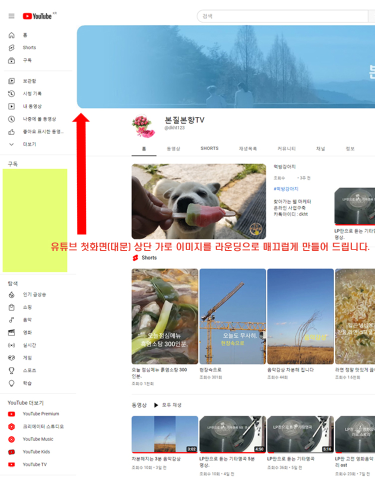 ** 유튜브 첫화면 대문(상단이미지)에 들어갈